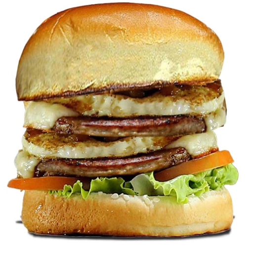 Pão de brioche, 2 burgers blend de 120g, fatia de cheddar, 2 ovos, alface, tomate e cebola caramelizada