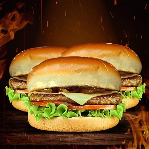 3 burgueres de 120g cada, fatia de cheddar, alface, tomate e cebola caramelizada